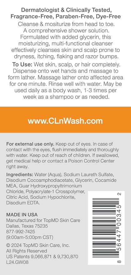 - Moisture-rich and soothing: Gently cleanses skin and scalp, restoring balance and promoting a more comfortable and healthy feel. A gentler alternative to CLn BodyWash and CLn Shampoo.