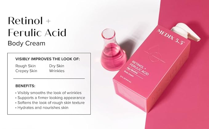 - NOURISHING INGREDIENTS FOR SMOOTHER LOOKING SKIN – Medix 5.5 Retinol Body Lotion Moisturizer Cream is the perfect combination of ingredients with natural-antioxidants to help promote a visibly radiant complexion and a more youthful look. Infused with Retinol, Ferulic Acid, Shea Butter, Vitamin E, Green Tea, & more to nourish skin, visibly enhancing its texture and tone. This blend promotes a smoother, more youthful appearance.