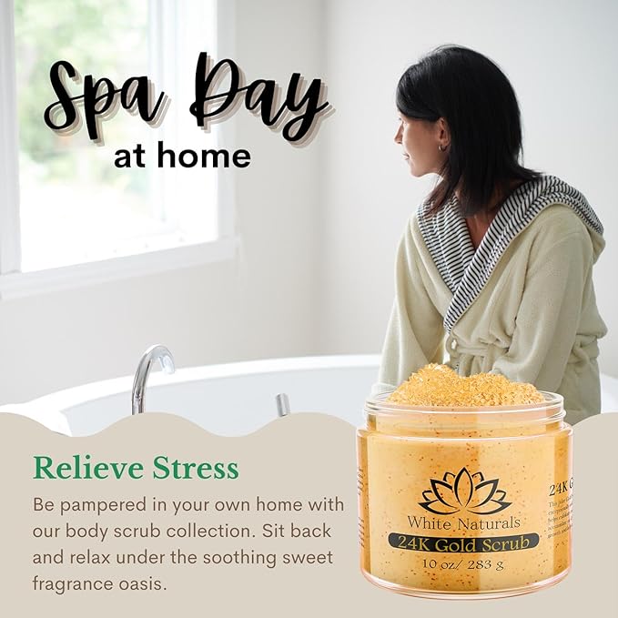 - A 24K TREATMENT AT HOME: Why spend a fortune at a spa when you have a luxurious treatment at home? The 24K gold scrub will offer you an unforgettable exfoliating experience and the results will be amazing, even from the very first use! If you want to have a 24K spa experience daily at home, the White Naturals body scrub is all you need!