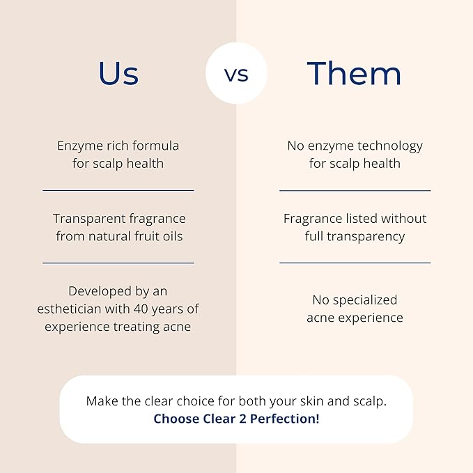 - IDEAL FOR ACNE-PRONE SKIN: Clear 2 Perfection’s non-comedogenic formula is perfect for acne-prone skin, including bacne. It’s a comprehensive solution developed to ensure your skin stays clear and your hair stays healthy.