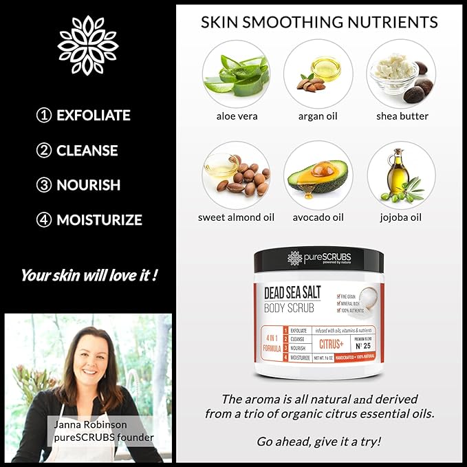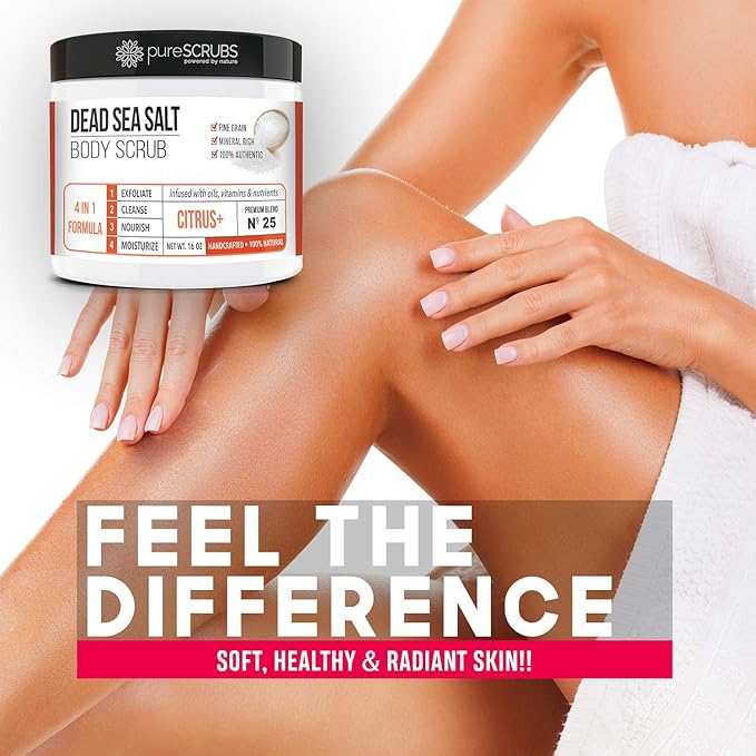 - GET ULTRA SMOOTH SKIN FAST - THIS WORKS! Our unique “4 in 1 Formula” does everything a body scrub should do and more - EXFOLIATE, CLEANSE, NOURISH & MOISTURIZE. Fine grain dead sea salt infused with essential oils, nutrients and skin softeners helps to smooth away rough, bumpy, and uneven textures to instantly reveal your true soft, healthy and radiant skin. You'll love the citrus aroma!