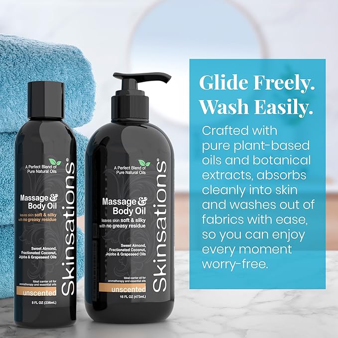 Skinsations - Unscented Massage Oil for Massage Therapy - 16oz | Fragrance-Free Body Oil for Sensitive Skin & Aromatherapy | Sweet Almond, Jojoba, Coconut & Grapeseed Oils