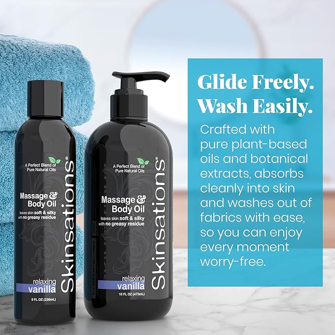 Skinsations - Vanilla Massage Oil for Massage Therapy - 8oz | Body Oil for Relaxation, Sore Muscles & Aromatherapy | Sweet Almond, Coconut, Jojoba & Grapeseed Blend