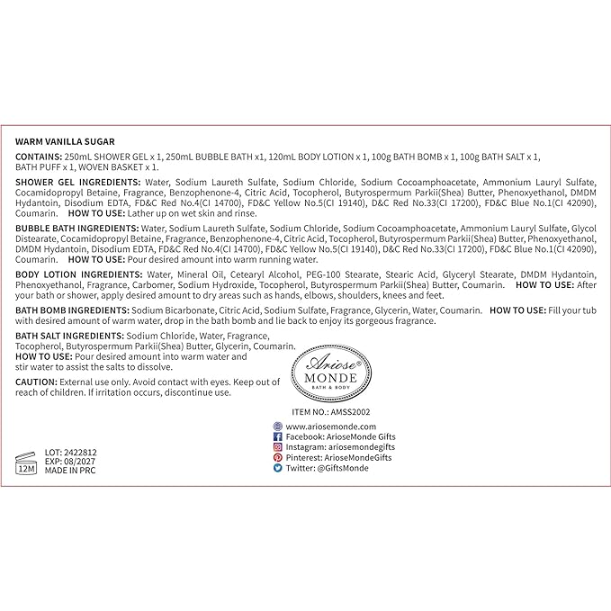 - NATURAL INGRIDENTS: All the Ariosemonde Spa sets are cruelty and praben free, We do not test our products on animals. They’re made from natural ingredients, they also give off a natural and gentle scent