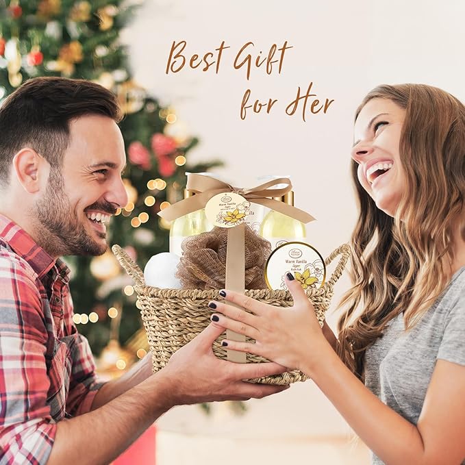 Bath and Body Warm Vanilla Sugar Spa Gifts for Women, with Shower Gel, Bubble Bath, Body Lotion, Bath Bomb, Bath Salt, Spa Basket Gift Set for Women, 7pcs Set Gifts