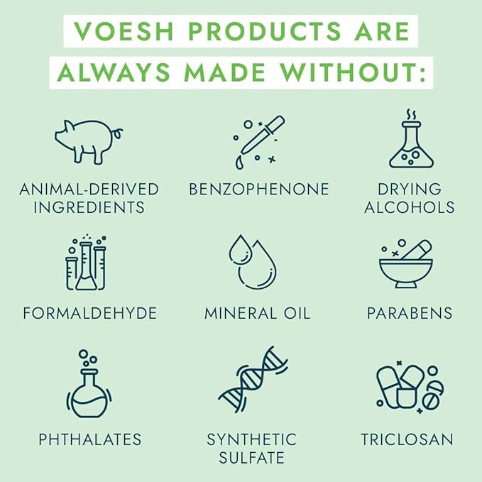 - 100% Vegan, Clean & Cruelty-Free. VOESH products are free of animal-derived ingredients and we never test on animals. Our formulas are developed with high-quality ingredients from the finest natural sources. We proudly exclude 1680+ EU-banned ingredients plus an additional 400+ questionable ingredients.