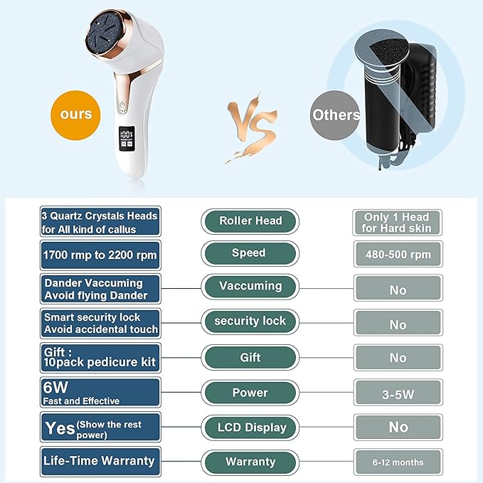 - Pedicure kit with 3 Grinding Head, 2 Speed, with VACUUM ABSORPTION----- 3 Quartz Crystals Removable Roller Heads and 2 Speed Correspond to the roughness required to remove the calluses on the feet. UPGRADE powerful callus remover with dander vacuum cleaner quickly sucks away foot scraps, cle.an and hygienic, and sucks while grinding. dust-free, and foot scraps will not be scattered in air or floor, an essential home pedicure kit for people who has cleanliness.
