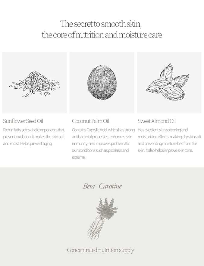 - Natural Skin Nourishment – Enriched with sweet almond oil, coconut palm oil, and sunflower seed oil to deeply hydrate and keep your skin smooth, soft, and healthy.