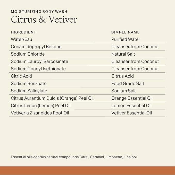 - Citrus and Vetiver - This all natural body wash is made with essential oils and fractionated coconut oil for a lighter, less greasy feel. This sublime formula combines energizing scents to create a refreshing, uplifting blend.