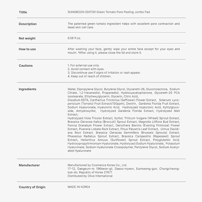 - [PORE MINIMIZER & FIRMING SUPPORT] : Formulated to tighten pores and improve skin elasticity, these pads help create a smoother, firmer appearance. Regular use reduces the look of enlarged pores for a refined complexion. Enhanced with SUNGBOON EDITOR's unique green tomato extract, it effectively supports pore care and contributes to clearer, healthier skin.