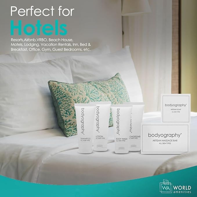 Bodyography Blanc Mini Travel Size Toiletries Bathroom Kit | Vanilla White Tea| Shampoo, Conditioner, Body Wash, Lotion, Artisan Soap and Massage Bar