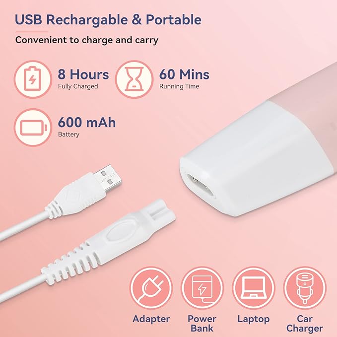 - 【USB Rechargeable & Anti-slip】Trimmer for women comes with a USB cable, which can be connected to any USB device like power bank, computer, laptop and socket. After about 8 hours of charging, the shaving time is about 90 minutes. Perfect for every businesswomen and travelers. The body of this face shaver adopts a non-slip ergonomic design with modern appearance, which has both a sense of grip and beauty.