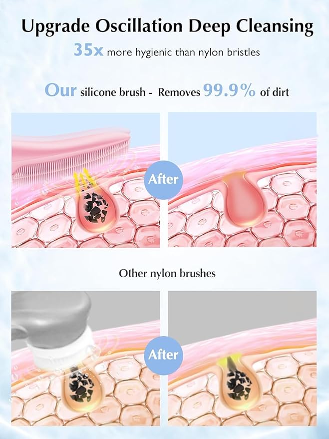 - 4 CLEANSING MODES AND EYE FUNCTION: The portable face cleansing brush device has 4 cleaning modes, easily meeting different cleaning needs, making your skin clearer more vibrant. The innovative triangular constant temperature 40° heating zone on the back effectively improves in the eye area, lift the corners of the eyes
