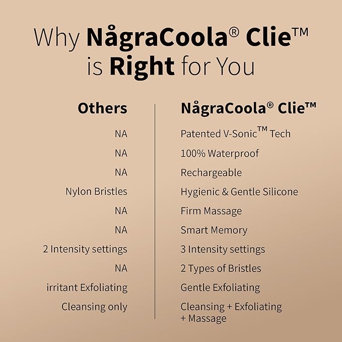 - DEEP CLEANSING: It features an iconic handle design. CLIE 2.0 face cleansing brush equips professional-caliber technology that uses pulsation to cleanse deeply. Featuring sophisticated V-Sonic Tech, NågraCoola face scrubber gently clears pores without harsh abrasion or chemicals, cleansing so effectively that skin care products absorb better. Results includes 6X better cleansing than manual cleansing, reduce appearance of pores, and improve skin tone.