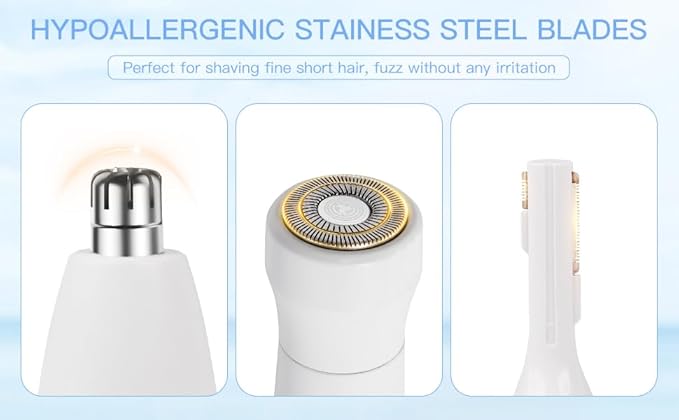 - 【3-in-1 multifunctional Trimmer】Experience painless and smooth hair removal with HEBECA 3-in-1 Facial hair trimmer, provides silky and soft skin hair free, suitable for the whole facial hair removal, face, eyebrow, nose, lips, chin,neck, peach-fuzz etc