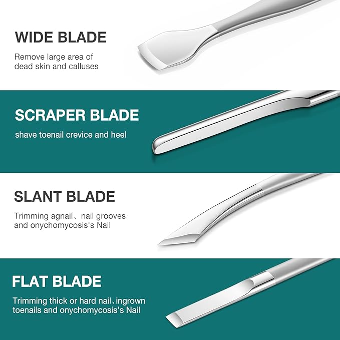 - This is a multi-functional pedicure knife set, covering a variety of practical accessories, four different combinations of accessories are available to meet different needs.