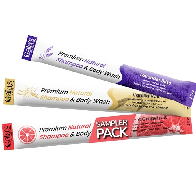 GAIA'S Premium Natural Shampoo and Body Wash All 3 Scents Sampler, 6 oz (2 oz X 3) No Added Colors, Tear Free, Organic and Natural Ingredients, Travel Size, No Sulfates