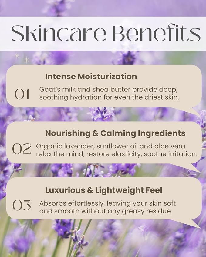 - LUXURIOUS FUSION: Immerse yourself in a lavish blend of lavender, goat's milk, sunflower oil, shea butter, and coconut oil for a skincare experience like no other.