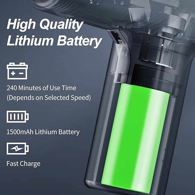 - massage gun is equipped with a powerful 1500 mAh lithium battery and comes with a USB charging cable (charging plug not included) Continuous use for up to 6 hours (depending on the selected speed) The deep tissue massager will automatically stop running after 15 minutes of continuous use. Provide thoughtful protection for your health and effectively protect battery life.