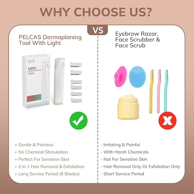 - [Great Quality & Service]-Package includes: 1*PELCAS Mini Dermaplaning Tool With Light (5.12*1.1 inches),1*Type C Charging Cable, 6* Replacement Blades(2 types) , 1*Manual. PELCAS provide 24H online reply.