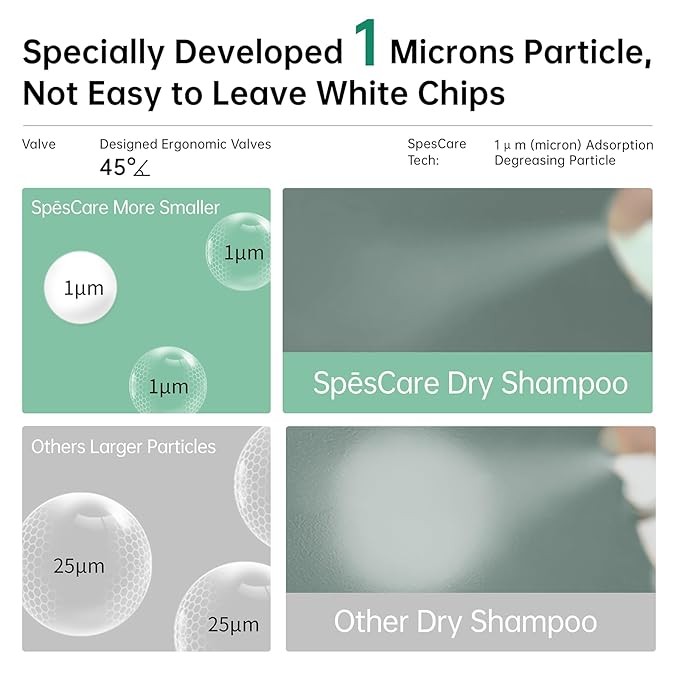 - NO WHITE RESIDUE AFTER USE: Spescare Instant Fresh Volume Dry Shampoo uses a unique patent to make the diameter of the cleaning particles only 1 micron, which is 1/200 of the diameter of the hair. It instantly absorbs oil and restores fresh and volumized hair without leaving any white streaks or residue on your hair.