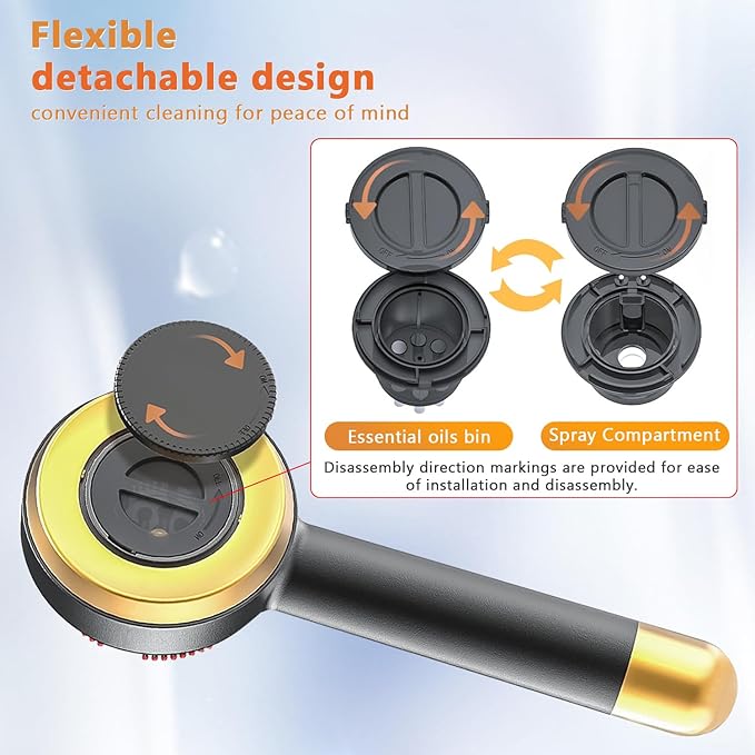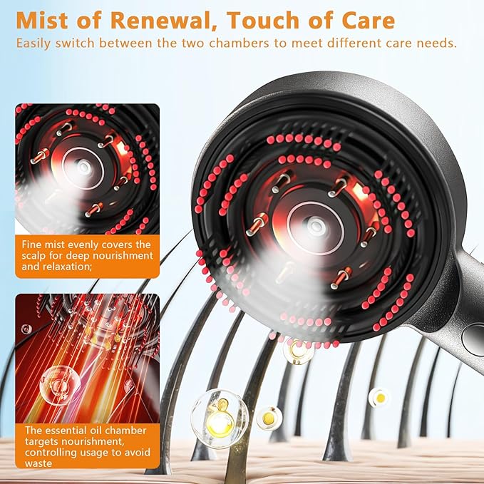 - Featuring an advanced atomization chamber, this massager evenly disperses essential oils in a fine mist while you massage your scalp. The mist helps the oils penetrate deeply, promoting better absorption and delivering soothing, nourishing benefits to your hair roots. Easily switch between essential oil and atomizing chambers for a customized scalp care experience. Just attach your preferred chamber, and enjoy targeted nourishment or a soothing mist, perfectly tailored to your hair care routine.