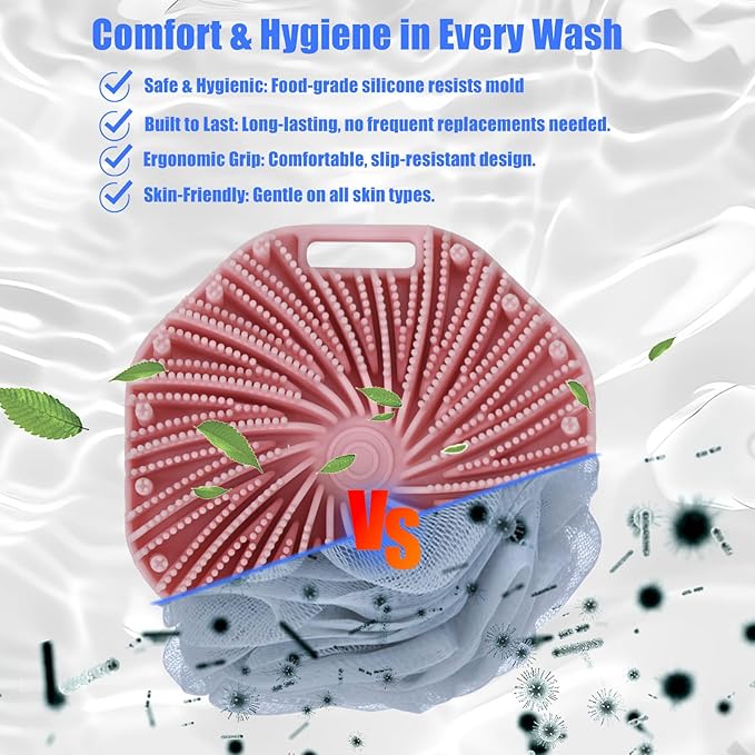 - Gentle Silicone Bristles for Exfoliation:Our silicone body scrubber is designed with soft, gentle bristles that exfoliate without irritating your skin. Perfect for body scrub, this scrubber removes dead skin cells while leaving your skin smooth and refreshed