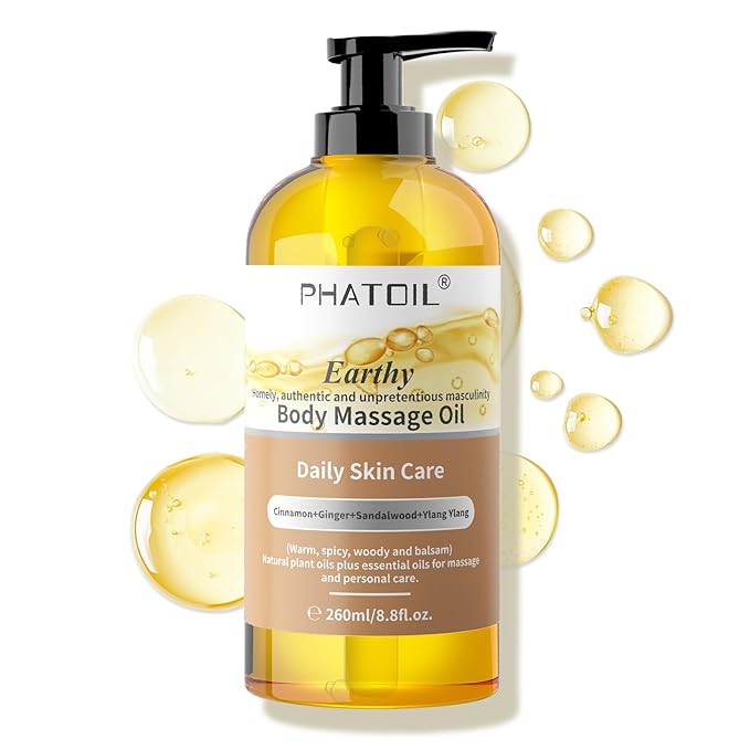 - 【Scent Feature】Earthy Body Oil is an oil with a warm, spicy, woody and balsam scent. And including sandalwood oil which has a little sweet delicate floral fragrance. This scent is very powerful and extremely beneficial. Enjoy the complex blend of natural plant oils and essential oils, with Cinnamon oil, ginger, sandalwood, YlangYlang essential oils. Earthy body oil fragrance lasting, full of strength and passion, make the body more energetic, play a masculine charm
