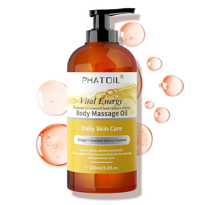 - 【Scent Feature】Vital Energy Body oil is formulated with ginger and juniper berry to restore balance to your body, Fresh lemon oil to moisturize and soften skin for nourishment. Vital Energy body oil is bringing you spicy, citrus, earthy and fresh feeling, which can stimulate blood circulation, make the skin more rosy and healthy, bring vitality and energy