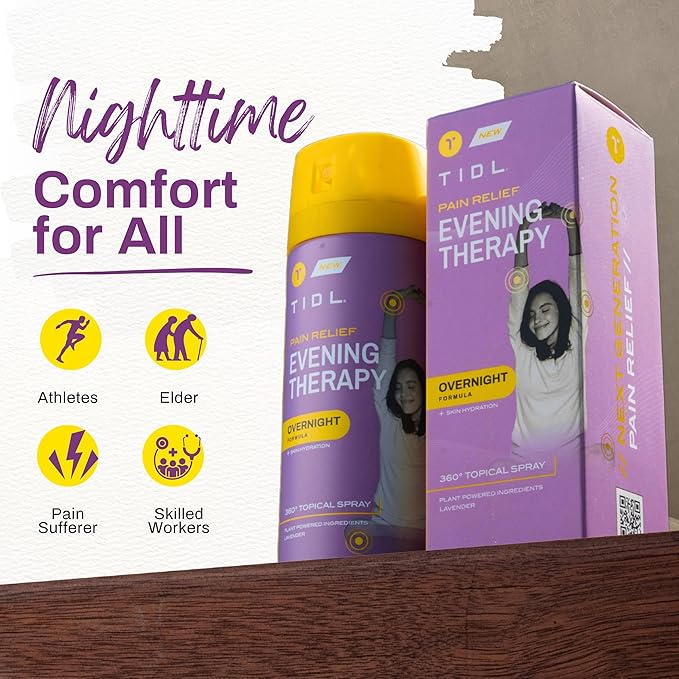 - NIGHTTIME PAIN RELIEF: Experience nighttime comfort with TIDL pain relief spray, featuring dual-action muscle pain relief spray with spray for strength and menthol spray for joint relief. This pain relieving spray with calming lavender scent soothes aches while promoting better sleep, ideal for evening therapy routines.