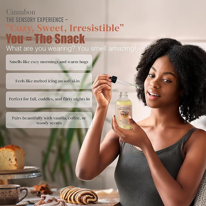 - 🌀 Bakery-Fresh Cinnamon Roll Scent – Sweet, Warm & Comforting All Day Long This body oil smells like stepping into a Cinnabon bakery—starting with bold, aromatic cinnamon, flowing into rich, sugary glaze, and finishing with smooth vanilla cream. It's a dessert-lover’s dream in a bottle, with a scent that lingers sweetly on your skin.