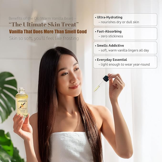 Warm Vanilla Bean Body Oil - Moisturizing Body Oil for Soft, Glowing Skin with Almond & Jojoba Oil (4 fl oz)