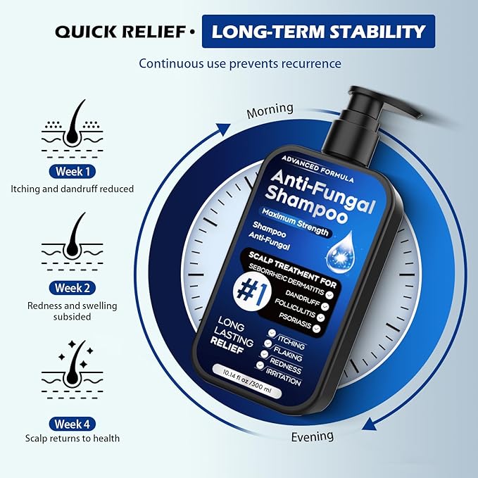 - MULTI-EFFECT ANTIFUNGAL SHAMPOO: specially designed for people with folliculitis, seborrheic dermatitis, and scalp psoriasis, it can quickly relieve itching, redness, flaking, and stubborn dandruff caused by fungi, and inhibit inflammation from the source.