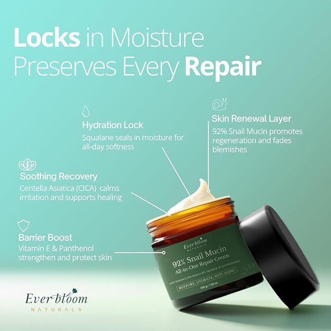 - POWERED BY SNAIL MUCIN & PLANT-BASED ACTIVES: This advanced snail mucin cream blends 92% snail secretion filtrate with Centella Asiatica (CICA), squalane, panthenol, and vitamin E. Together, these skin-friendly ingredients support deep hydration, barrier repair, and regeneration—creating a potent multi-functional formula inspired by Korean Skincare innovation.