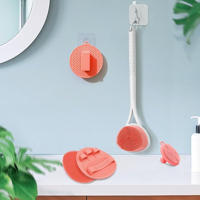 - 【Easy-to-care & Eco-friendly】Silicone back/body/face scrubber set is easy to clean, quick-drying and no molding. You just need to rinse and hang dry. It’s super durable to last for a long time. Package includes: back scrubber x1, body scrubber x1, face scrubber x1, Stick hook x2, Hang strapx1.