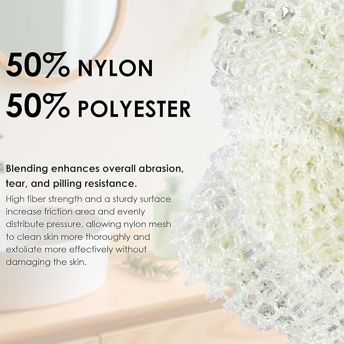 - Reveal Softer, Smoother Skin – Durable nylon mesh buffs away dead skin and rough patches to enhance exfoliation. Slightly hard and prickly, but safe on the skin, it deeply cleanses, promotes renewal, and leaves the skin softer, smoother, and more radiant, while improving lotion absorption.